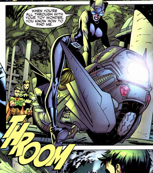 And yes, we have the love triangle here : Talia - Bruce - Selina. Obviously, Batman likes dangerous women. Tim is so young here I thought he was Damian. Once again Jeph Loeb manages to hold my attention with the plot because of a very well-conceived explanation of the key differences of all three Robins : Dick, Jason and Tim. Observations coming from the Batman himself. Lots of delightful details on each Robin. Some tidbits: Dick is the most physically gifted, Jason the angriest, and Tim is the best detective. It's really not that simplistic; Bruce takes time to mull over the men who've served as Batman's partners over the years and its just a great read. We find Selina in the Batcave here. She borrows one of Bruce's bikes - and what a bike! Just the latest of many gorgeous machines in Hush.