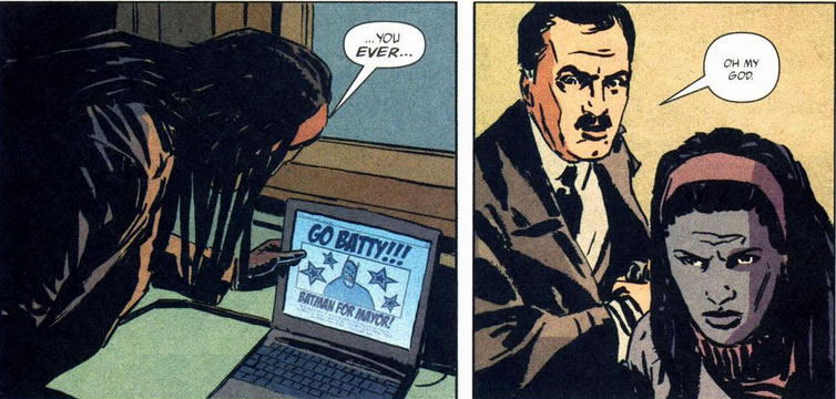 Hey this is a comicbook right? How about we put in a discussion of the municipal budget? Nah, nobody does that in a comic. Wrong! It happens in issue 12 and I love it. Right at the beginning the Mayor and the Police Commissioner bargain about the GCPD budget. I enjoyed following the quite sensible opinions of both as they kicked the issue around. Aside from being fun to read this discussion makes me aware that the cops are working people, they have shifts, they do overtime. I become aware of this as the series moves on and it adds to the believability of the GCPD aspect of the stories. This in turn makes the superhero/supervillain aspect stand out. Brilliant, just like 'Marvels'.