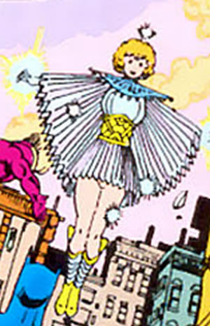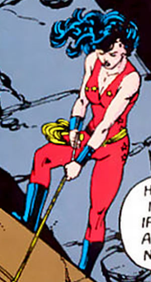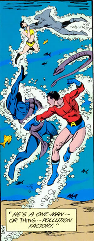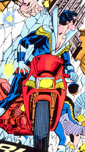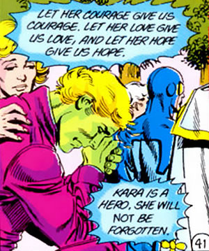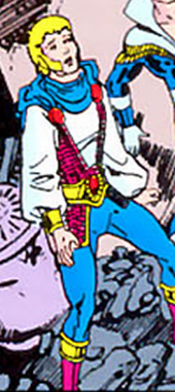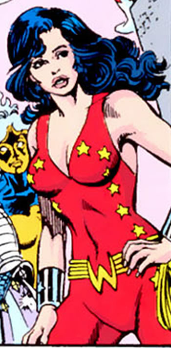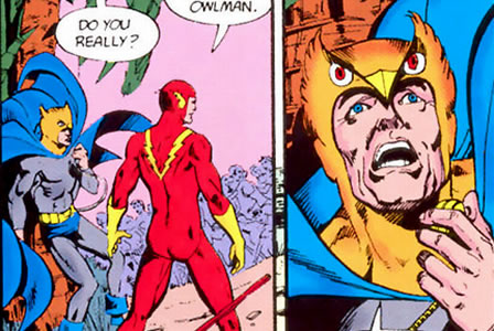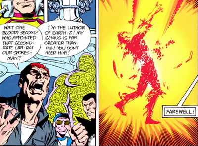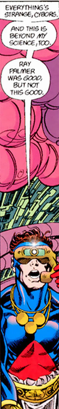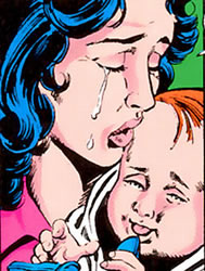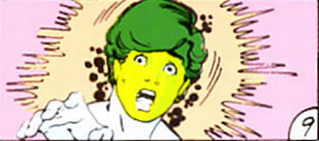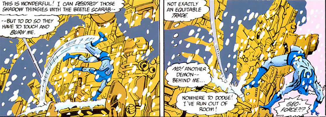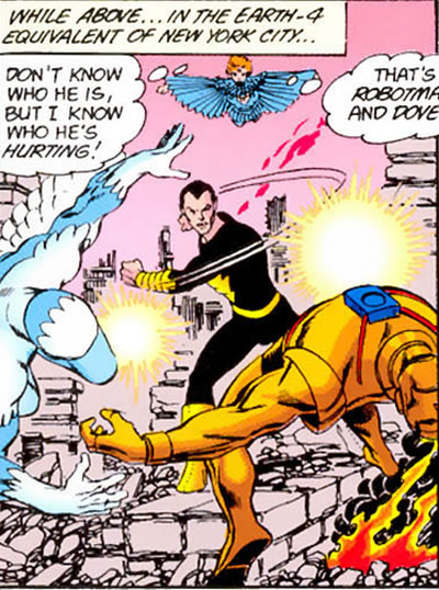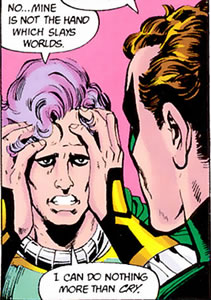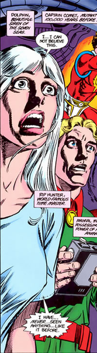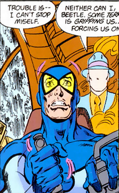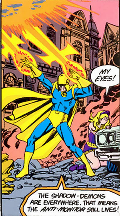 Power Ring is the villainous equivalent of Green Lantern and a member of the Crime Syndicate. The Crime Syndicate operates on Earth-3 and has a member equivalent to each major member of the classic JLA save Martian Manhunter; they are all villains on their world. And who's the lone hero? Lex Luthor . Ha! Look at Power Ring's gear up close. Not an Oan ring for sure. ![]() On Earth-3 Batman is Owlman. ![]() Here's Alexander Luthor, the son of Lex Luthor of Earth-3, still a baby, with Mom crying before they send him out, to save him from the anti-matter wave sweeping the planet. ![]() Many, many years from hence he will play a key part in yet another big DC event - Infinite Crisis - as a villain! This panel, and the dialogue to go with it, explains why I absolutely detest Pariah. ![]() His power : whining and crying. babeshot : Dawnstar of the Legion of Super-Heroes ![]() Here's Blue Beetle in the middle of a fight. ![]() Blue Beetle is not an original DC character. He became part of the DCU when DC bought Charlton Comics. I had the good fortune to read some of the Charlton Blue Beetle issues . This is the exact way he moves in a fight even then. It's a good decision for DC to continue the signature fighting style. The DC Blue Beetle is actually Blue Beetle II. The first Blue Beetle was a character from Fox Features Comics. Here he is.