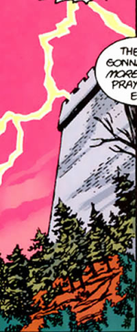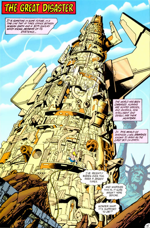 Soon there are only five universes left. In these universes the Monitor has set up a defence : Tuning forks designed to combine the universes into one defensible universe. Check out one of the Monitor's Tuning Forks courtesy of George Perez. The guy climbing it is Kamandi . In the DC universe Kamandi is the first Homo Sapien and comes from an earlier age. In Crisis, not only the universes but the timelines also temporarily merge with each other.