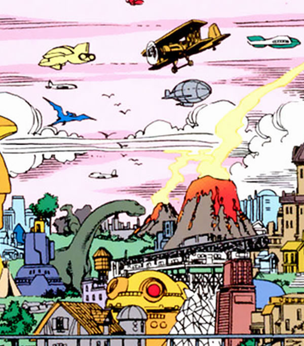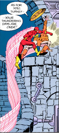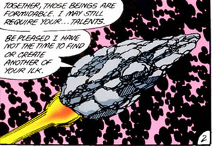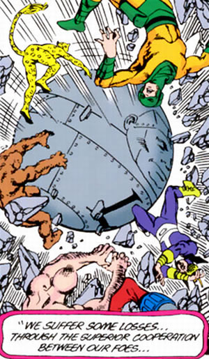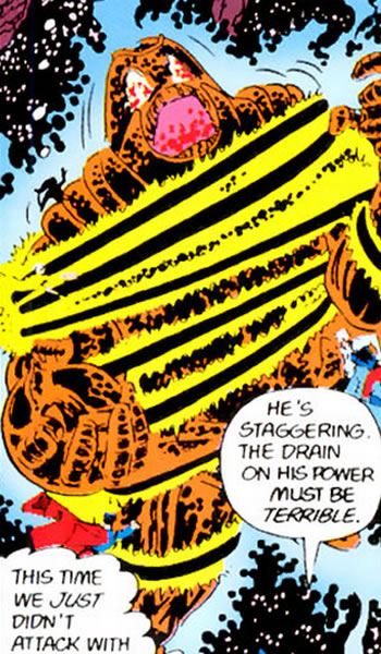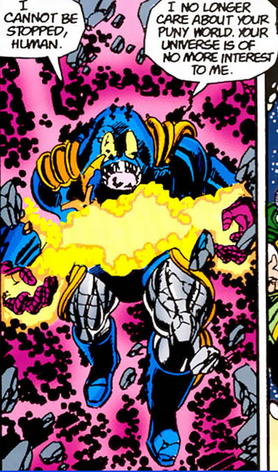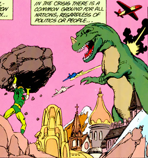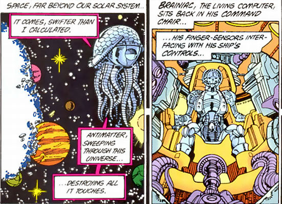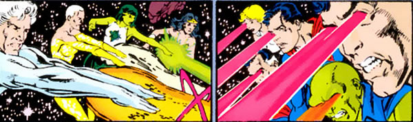 The Anti-Monitor retreats. This is the battle that would kill Supergirl. Brainiac 5 is particularly hard hit. He was courting Supergirl. ![]() A little poem at the end to close a fantastic issue ![]() I'm not too keen on the design of the Anti-Monitor, his base, and, as shown below - his ship. You're one of the most powerful beings in the multiverse and you ride a flying rock. ![]() After he was forced to retreat, the Anti-Monitor commands the weaponnaires of Quard to create an anti-matter cannon to destroy the last five universes. ![]() Fortunately, Barry Allen is here to stop the construction. ![]() After getting stopped by the Flash, the Monitor isn't finished. He goes to plan B : Absorbing the energy of a million worlds from his own anti-matter universe. ![]() This would piss off the most powerful DC hero of them all. And here he is. ![]() In the meantime, other things have been happening, here Cyborg and the Atom check out the Red Tornado. T. O. Morrow, who created the Tornado is on hand. The atom is on the inside, checking things out and he is stunned by the engineering. ![]() T. O. is quick to take the compliment ![]() But it seems that the Anti-Monitor was doing some reengineering of his own inside the Tornado ![]() The Martian Manhunter is vulnerable to fire. Here's a great shot of Firestorm using his power to create some water to shield the Manhunter. ![]() Here's more of DC history, the Challengers of the Unknown. ![]() He's mellowed down these days, but back in '85 Guy Gardner was such a boor. The only one with more attitude was Lobo. ![]() The villains, ever the opportunists, organize under these two. ![]() I'm no fan of Luthor's armor and I would've bet it wouldn't make it to the twenty-first century. But he's still wearing that thing as of Infinite Crisis, twenty years later. The villains take over three of the five earths. And just like that, the original Luthor, the Luthor of Earth-2, meets his end. ![]() Once again, look at Perez's detailed pen. This is a landscape that shows the timelines mixing up. ![]() babeshot : Wonder Girl ![]() Oh, it is so nice to see the Creeper again. I love this character. He had a backup series in World's Finest Comics in the 70s. This guy's pretty awesome. He's agile and has superhuman strength (just very strong, not even Spiderman class) and can climb walls (powers very closely resembling X-Men's Beast who could lift 2,000 pounds). Aside from that, he had a healing factor strong enough for him to recover from gunshot wounds. Hearing him laugh can make people comatose. With the villains rampaging on three earths, the heroes rig a cosmic treadmill to go and take them out.