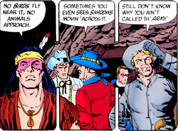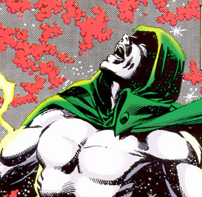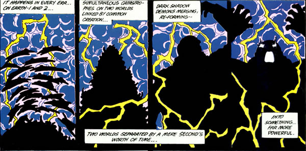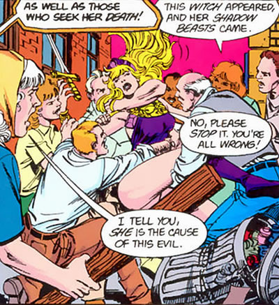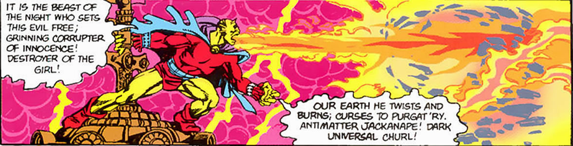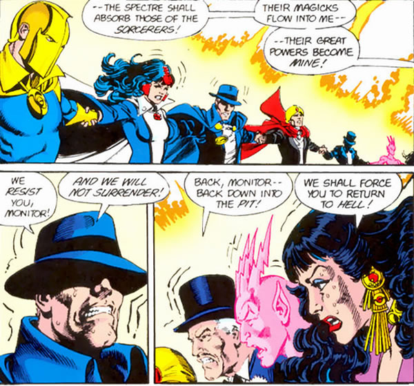 In spite of the singular universe, it's not over, as the shadow beings arrive en masse. Here are two of the best mystical power manifestations: Etrigan with flames coming out of his mouth.