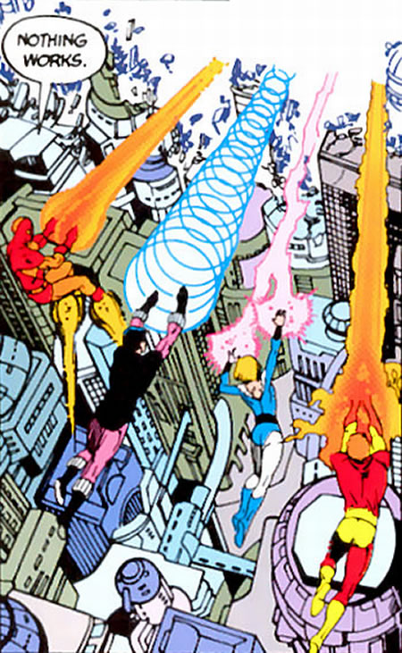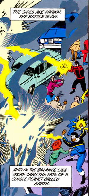 Everybody's here, even DC's Western heroes. I recognize Scalphunter (leftmost) and Jonah Hex (rightmost). ![]() This is the Legion of Super-Heroes I know and love. Wildfire (with the dialog) is my favorite. ![]() I particularly like the concept of the shadow creatures merging into one dark giant in each of five locations defended by a group of heroes. It's a structure that accommodates what otherwise would be too many combatants. ![]() Perez drew small but detailed figures in small panels. The overall effect is giving the reader a sense of the immensity of the event. Here are some samples.