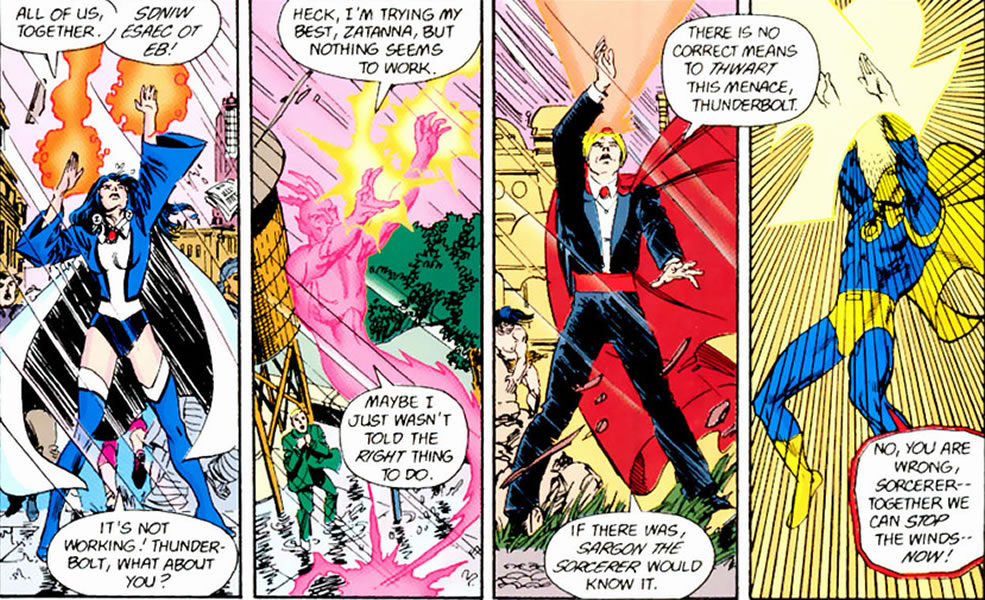 Here's a nice multi-panel shot of the magic-based heroes. The last panel is of Dr. Fate, a big favorite of mine, look at his spectacularly rendered mystic blast, the shield shape is wonderful.