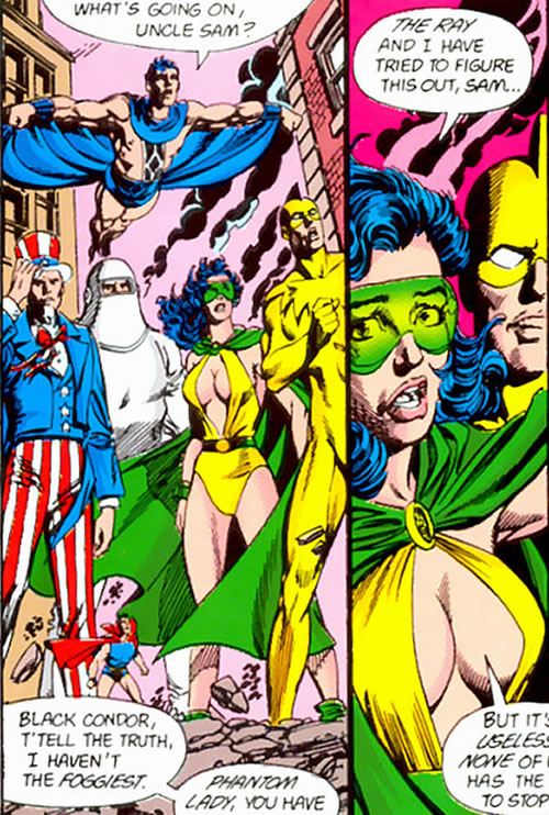 The next pages show all the heroes fighting all the villains. Just total enjoyment. Here are some choice scenes. ![]() ![]() ![]() babeshot : Phantom Lady again.