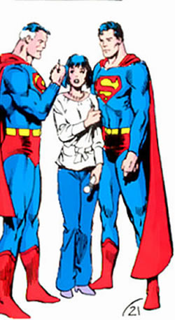 These are the two Supermen. One way to tell them apart is by the different stylized 'S' on there chests. The 'S' symbol means 'hope' in their native Krypton. This panel further shows Jay Garrick, the golden-age Flash, explain how things are going to be post-Crisis.