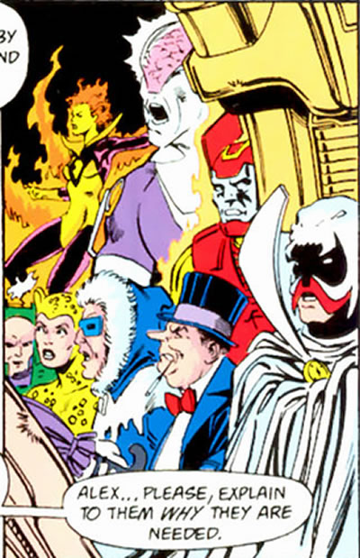 Here's a roster showing a small sampling of the heroes and villains in this event. The Anti-Monitor is the villain of the series. He sends out these shadow creatures to attack everybody else.