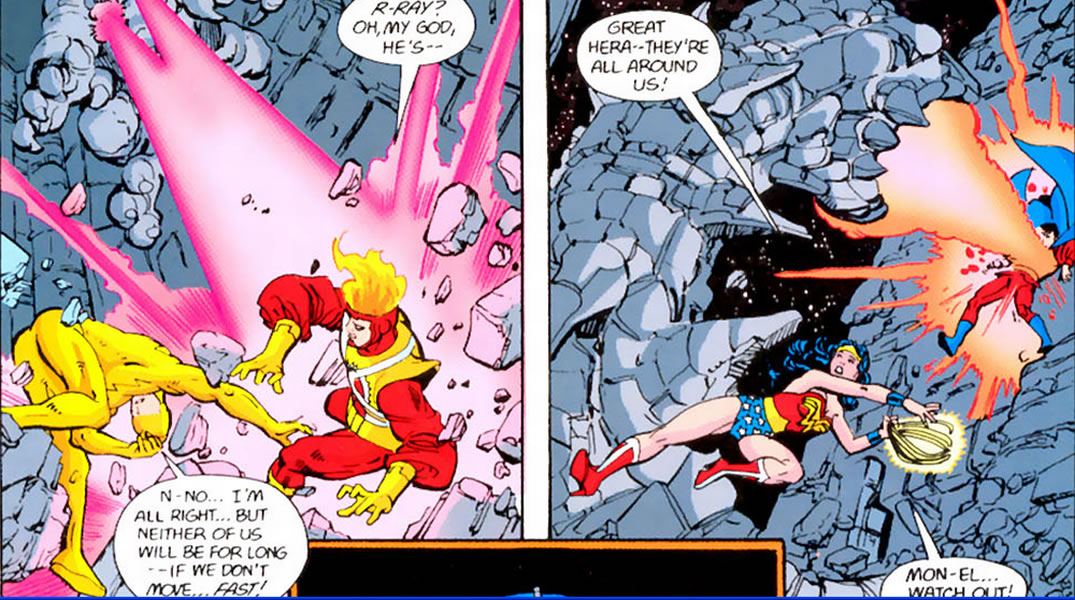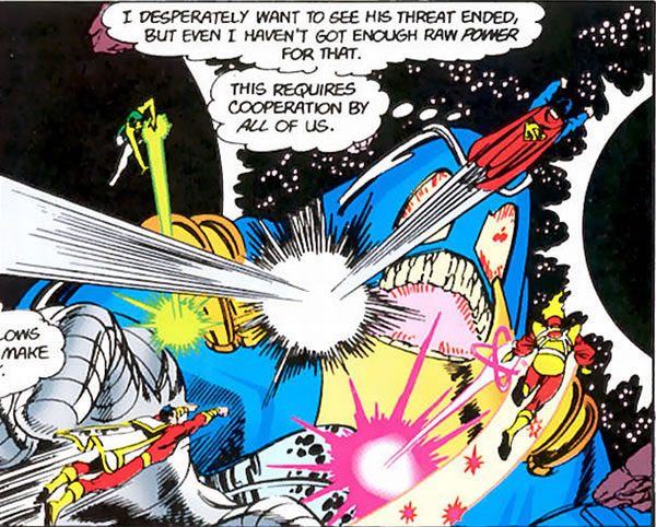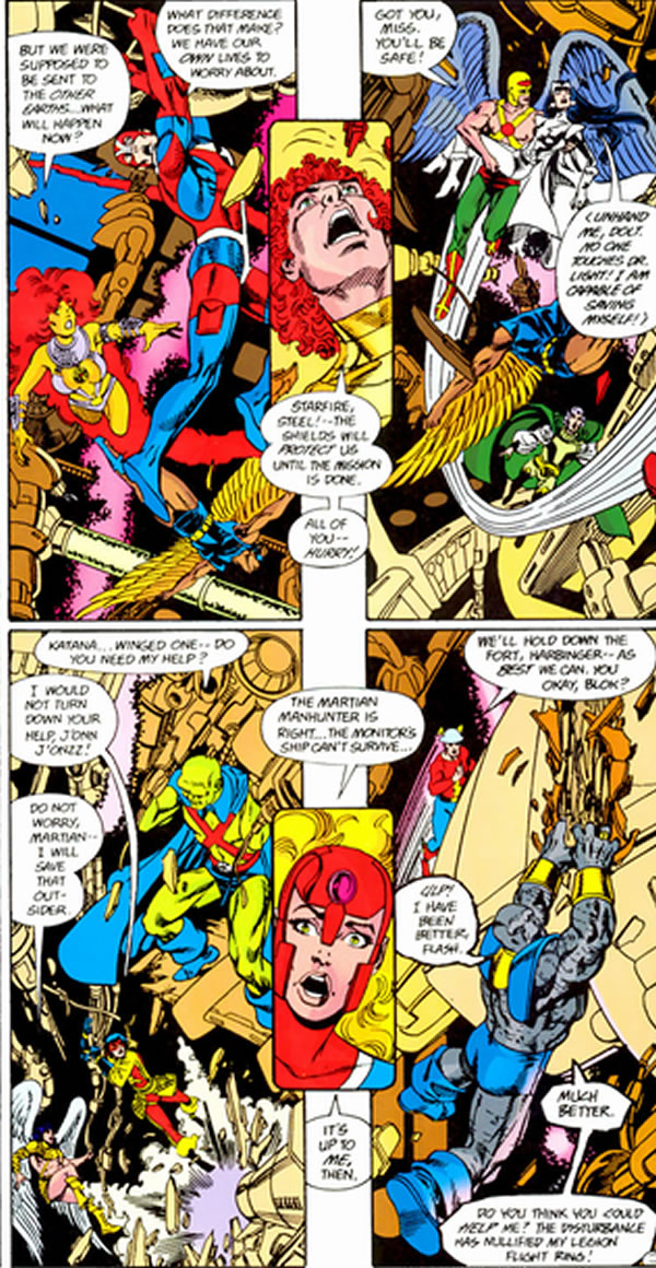 The construction of the Manhunters by the Guardians are shown here. Precursors of the Green Lantern Corps, the Manhunters went amok and killed those they should have protected (are you listening Hal Jordan?). In doing so they inadvertently created the Red Lanterns, the epitome of rage. 'Millenium' is the DC limited series that tackles the final resolution of the Manhunters. ![]() The heroes of the afterlife are here too. ![]() With the earths temporarily stabilized, the heroes decide to attack the Anti-Monitor in order to protect the precarious victory. And here's my first critique of George Perez. He could have done the Anti-Monitor HQ better. It looks like slum housing. ![]() The big battle scene in the Anti-Monitor's place is a must see. It establishes the Anti-Monitor as a definite powerhouse. Here are the most powerful heroes of the DCU: the Superman family, Shazam, Firestorm, Alan Scott to name a few and they are getting creamed. Do not miss. Here's a teaser.