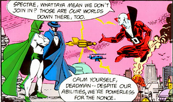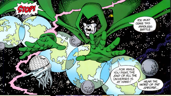 That hand is the Anti-Monitor's hand so this is along the lines of a cosmic-level arm wrestling. Behind the Spectre the magical heroes are reinforcing his power.