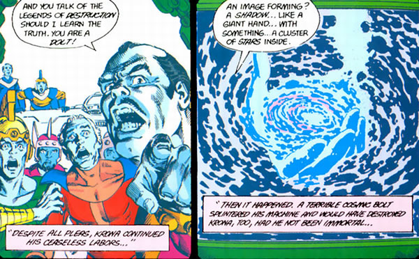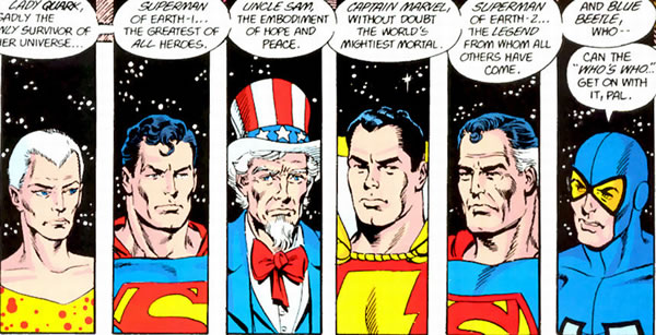 In this issue the last five universes have been drawn together but not yet unified. ![]() It all comes down to a select group of heroes: ![]() Lady Quark is nuclear powered so it's the Beetle on the lowest rung of the power scale. Considering there are two Supermen and Shazam here I'd feel pretty safe. This is Krona and his mad scheme to look into the forbidden : the beginning of time. Krona is a familiar figure to long time readers of DC. His actions still continues to surface as an integral part of the DCU mythos. ![]() Here we get into the history between the Monitor and the Anti-Monitor. The problem with villains specifically created for events is that readers do not have a strong emotional bond with them so they lose a lot in terms of substance. I mean, if I see the Joker, I become aware of the many times I've read him, and the Joker becomes the Joker, you know, real, substantial. This instant histories just don't create that kind of connection. The solution would be to use an established villain - no, I won't say Darkseid anymore.