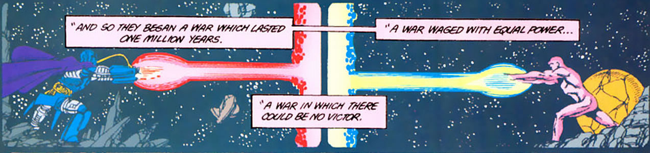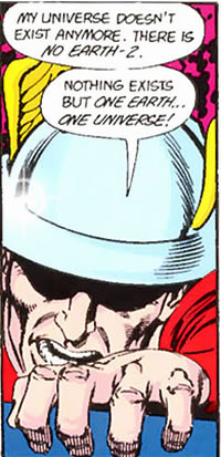 Posted - November 2010 | Updated : August 14, 2011 | April 23, 2012 | August 18, 2015 Previous: Conan Shadow of the Beast Crisis on Infinite EarthsWhat is Crisis on Infinite Earths?During the early 80s, the hottest creative team in DC was Marv Wolfman and George Perez. Their book, The New Teen Titans was number one, and deservedly so. When Crisis On Infinite Earths came out, it was hyped as an event that would forever change the DCU. All well and good, I dutifully bought nearly every issue, missing only 8 and 11, which I hunted down later. I bought those issues for a simple reason: I wanted to see George Perez draw every single character in the DC universe. And he did. Doing it in such a way as to rival even my highest expectations. DC has had many events since then, but for me this remains the event. For a long time, I lent out those twelve issues to people I wanted to attract to comicbooks, it was like 'Read this, this is how good comics can get'. Crisis on Infinite Earths presents the DC Universe circa 1985 in all its detail. Because of this, it's easy to lose the main plot points of the story. What I'll do as we go into the story is: I'll highlight the text that point to the main plot of the story so that it will be easy to see how Wolfman's tale moves along. Let's get started . . . The series starts with a wave of destruction destroying all the Earths/Universes. One Earth/Universe after another. Just like this one.