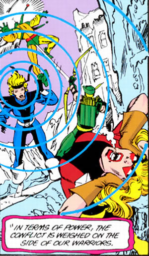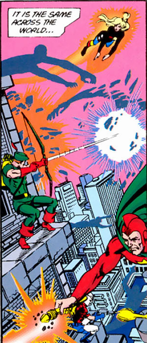 I'll let Harbinger announce the plan at this point. ![]() In the fight against the shadow creatures, I like these two shots in particular: Green Arrow. ![]() Black Lightning. ![]() Because Japan is known as 'The Land of the Rising Sun', the three heroes DC gave them are all solar-based. Here is Sunburst and Rising Sun. ![]() The third hero is the new Doctor Light - also solar-related. DC's Dr. Fate has a domicile almost as good as Dr. Strange's Greenwich Village sanctum over at Marvel. He has this one tower with no doors or windows.
