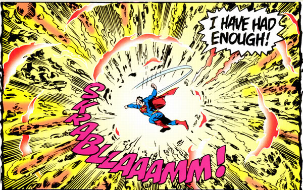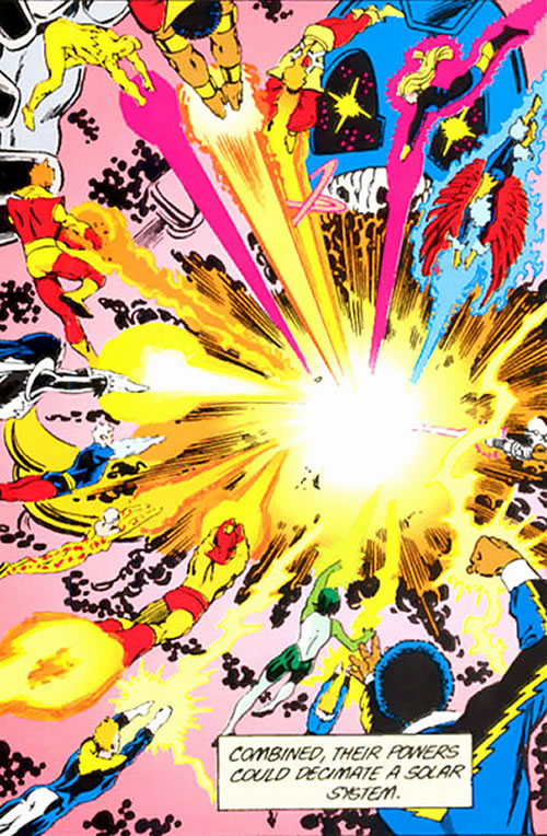 There is a two-pager showing most of the heroes. I've never seen anybody pack in this many bodies in two pages. Here is a detail of just part of a page. The big guy is Colossal Boy from the Legion of Super-Heroes. ![]() Did I say heroes? The villains are here too. ![]() Evidently Oa is not going to be any help here, the explosion below is the second one in Oa but this time the victims are the Guardians themselves. ![]() This fist is from the original Superman, the Earth-2 Superman. The dead giveaway? The sweater cuffs on the uniform. ![]() During the days of the cold war, DC gave Russia one super-hero - Red Star. Here he is.