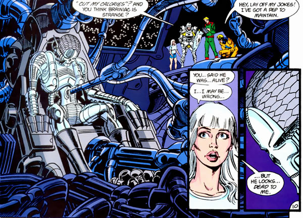 The discovery of Brainiac's ship by a group led by the Timemaster, Rip Hunter. The ship was floating lifelessly in space with Brainiacs robot body inside it. The angle of the shot reminds me of the scene in the movie 'Alien'.