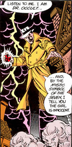This is Dr. Occult, a detective specializing in mystical crimes. He was kidnapped at a young age to be used as a sacrifice by a Satanic cult but he was rescued and trained in the mystic arts. The disc he is holding is the Symbol of Seven, it allows him to focus his magical energies.