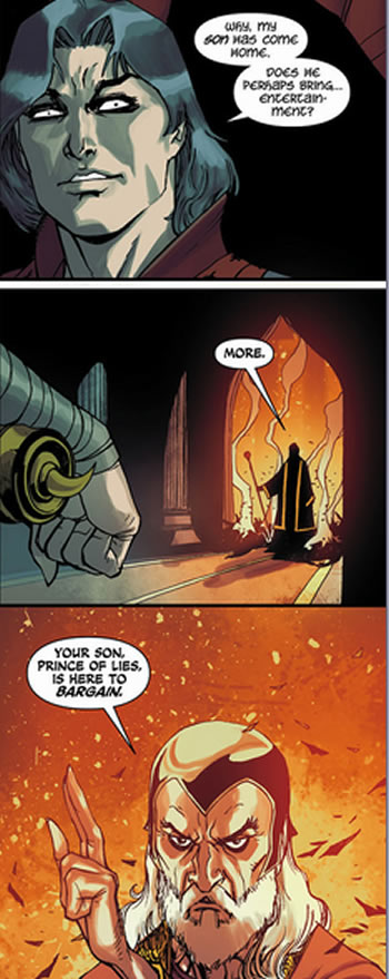 Yes. Merlin is Lucifer's son. That's an infernally high rank and dovetails exactly with the reputed power of the old mage - it explains, among other things, why he is able to master Etrigan. This issue's look back serves to deepen the series a bit. It presents wonderful art and is a great read. The only nitpick I have with it is its depiction of Etrigan's power such that he is able to best so many demons in an effort to rally Hell into a rebellion. It's just not believable, specially since Chang depicts this early Etrigan as a slim-bodied clerk type going up - and defeating - demons with far beefier physiques and in great numbers too. |