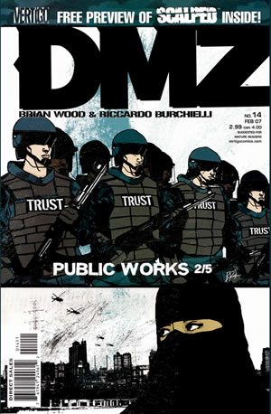 Excuse the title. It's a play on Hemingway's definition of courage: "Grace under pressure". In issue 14 of DMZ, the second part of the Public Works storyline, our undercover reporter Matty Roth is captured and subjected to a bout of torture. Let's see, he's stripped, put inside a meat freezing chamber, they douse him with water so that he really gets cold. They dunk him under water, almost drowning him. Of course there are the beatings; and in the end they make him kneel and put a gun to his head.
