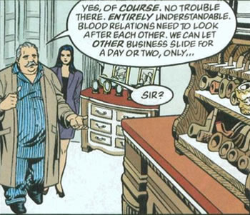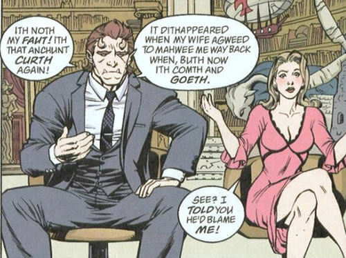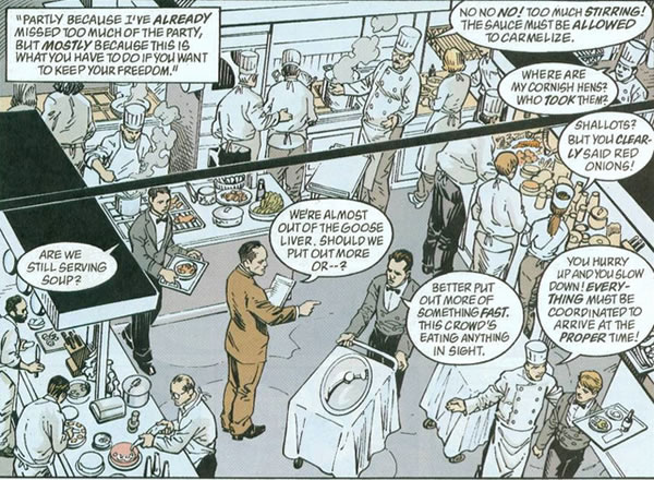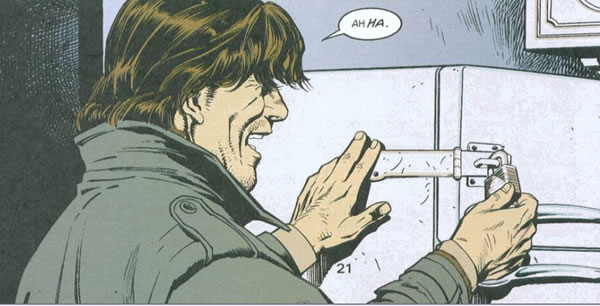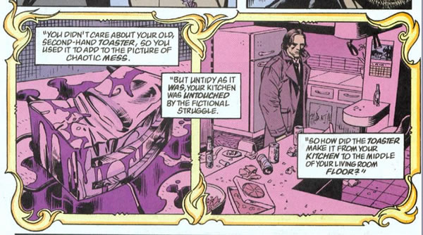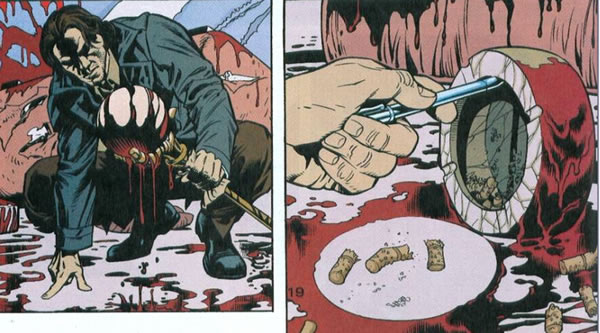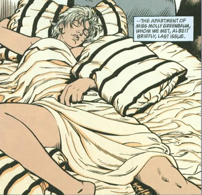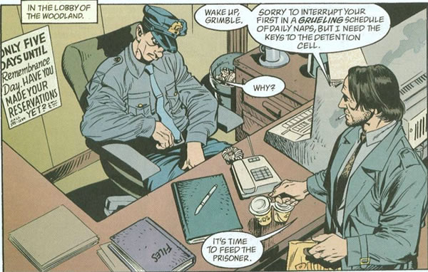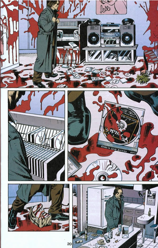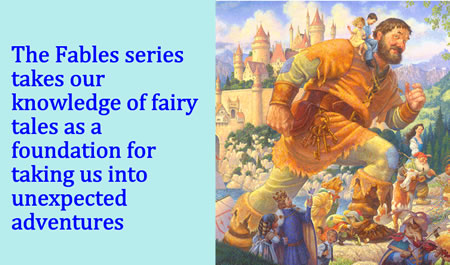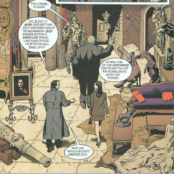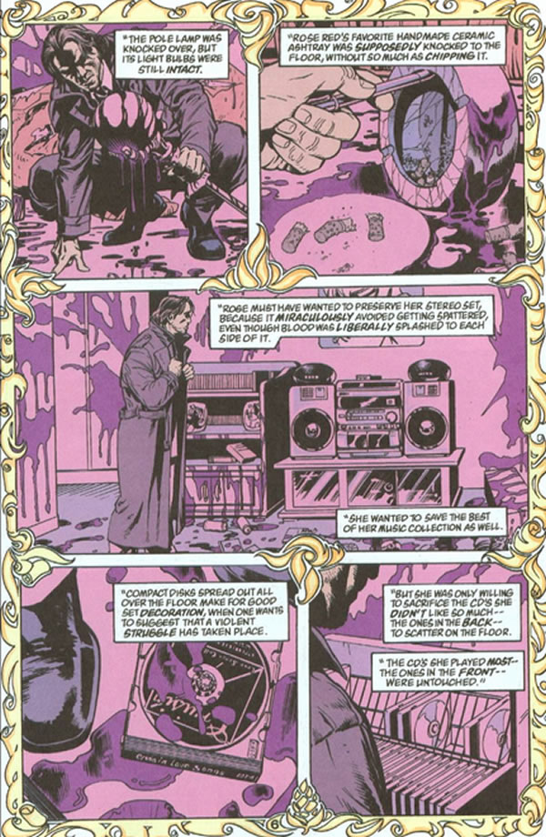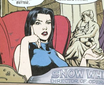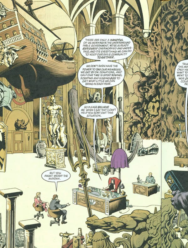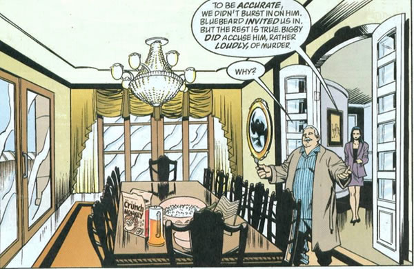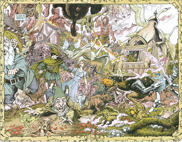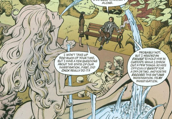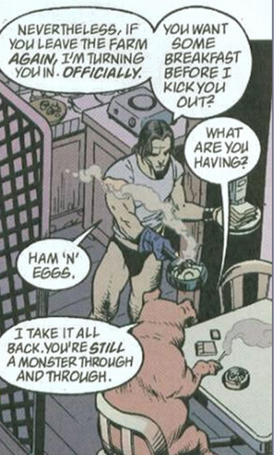 The incredible Fable series is from the mind of Bill Willingham. By the time I write this, I've already read every Fables issue up to the high seventies. So here, I'm looking at the first issue again. The first Fable we see is Jack of Jack and the Beanstalk fame. ![]() Then Flycatcher of Frog Prince fame ![]() Both go by so fast, but we'll soon be intimately familiar with these characters. Then Bigby Wolf of Three Little Pigs fame; hah! We'll even see one of the pigs later. But it's not Bigby that I notice here. It's his office. By the way, it also just occurred to me that if you happened to grow up knowing nothing of the fairy tales, the whole Fable series would be trash to you. ![]() Man, look at this. I love that he has his own coffee service; I always run out of brewed stuff at the office pot. Look at that ashtray, it is absolutely brimming. Bigby is a chain smoker for a reason: It dulls his wolf senses. He claims that if he doesn't smoke, the scent of the city will drive him insane. Another thing is that bulletin board behind him, what a horrendous mess, lots of stuff posted there, but then again I'm reminded that these Fables are immortal and Bigby's been working as head of Fable security for a couple of hundred years. The most baffling thing about the office is the office itself. You'll notice later that every other Fable administrator have lavish offices, not to mention Mayor King Cole's mansion in the sky, why does Bigby Wolf, Head of Security, no less, settle for this office? I mean, look at Snow White's office: ![]() Snow White is talking to two other Fables, Beauty and the Beast. ![]() Check out Beauty. Wow. By the way, art is by Steve Leialoha. Remember the story of Beauty and the Beast? Beauty falls in love with him and he turns back into a human? Well, it turns out there's a wrinkle to that tale: Beauty has to be in love with him continuously in order for him to retain his human form. Today, Beauty's not too fond of him that's why he gets the horns and the fangs. Not all Fables are human, I believe I just mentioned the three little pigs, non-human Fables get carted off to a location called the Farm so that they can't be seen by regular folks. The Fables live among us in absolute secrecy. Going back to Beauty and the Beast and the nature of Beast's humanity, he should request transfer to the Farm immediately. Anyone of you who is in a halfway serious relationship know that it is impossible for a girl to be in love with a guy continuously. If I was Beast, I'll probably be human every second Thursday, tops. And look at the nature of Beauty and the Beast's problem? Money. Oh boy. The big M. Beauty is working for minimum wage in a bookstore, I don't know what job the Beast is holding. Money?! The lack of money is the ultimate love killer. Oh yeah, have you seen Snow? ![]() gorgeous huh? Before we move on here's one last babeshot of Beauty ![]() All in the name of getting into a good mood people. Moving on . . . Here's another famous Fable, Prince Charming. ![]() He can seduce any girl. I hate him. There is something about him I like, though. This is no squeaky clean Prince Charming. Let's hear it from him. ![]() That's right, cocksmanship. ![]() There is a murder mystery here centered around this room. Who's been murdered? Rose Red, Snow White's sister from the lesser known tale Snow White and Rose Red. ![]() Just look at that. I've read the issue for the third time and my reaction is the same: It's just over the top. Too much blood really. And no body anywhere. Now what happens is that we're given a series of panels that are supposed to provide clues to the astute reader as to what happened. Here are the panels. ![]() ![]() ![]() The only comment I can make is that the ashtray has no blood underneath, so it was upended before the blood was spattered over it. I have no idea what that means. Seeing that I've read every Sherlock Holmes mystery and never once figured out the mystery before the end, it's no surprise that I'm clueless. I suck at detective work. I know though, that somewhere out there, is an armchair detective that is reading Fables for the first time and knows as much as Bigby knows based on the clues.Even before the big reveal in issue 5. To you I say Bravo! If your younger than ten years old, double Bravo! I did say that we'll be seeing one of the famous Three Little Pigs right? Well here he is. ![]() Because Bigby Wolf 'blew their houses down' a long time ago, the pigs feel that Bigby owes them. So one of the pigs escapes from the Fable Farm and crashes in Bigby's apartment. I thought something was showing on the tv in this panel but its the reflection of the room - great attention to detail. In a great move, Bigby offers Pig some breakfast. ![]() Ha! Babeshot. Remember the girl Prince Charming was 'entertaining' last issue. ![]() The script is pretty tight on this note but it really describes Prince Charming accurately. ![]() I think Willingham's take on the Prince is ingenious, and, after it's revealed, seems perfectly logical. Simply put the Prince Charming of Cinderella, Snow White, and Sleeping Beauty are all one and the same. He's an unfaithful mate and after hundreds of years they all hate his guts. Here we get a shot of the Woodlands Garden. Sculpted shrubbery, fountains, what a great setup. I live in the city myself, but where I am, its cramped and there's concrete everywhere. I just love seeing stuff like these. ![]() Jack, whom we saw earlier, is suspected of the murder of his girlfriend. It's the usual interrogation but what interests me is the dungeon cell they have under The Woodlands, complete with dim lighting, adobe walls, exposed toilet and rolled up mattress. ![]() If this was a cape comic, Snow White would be Diana Carter, Wonder Woman, strong, focused, charismatic. She's actually a pretty daunting personality for a cheesecake lover like me. It's nice to see her indulge her love of chocolates. And now we come to Bluebeard. ![]() Hmmm. From the
