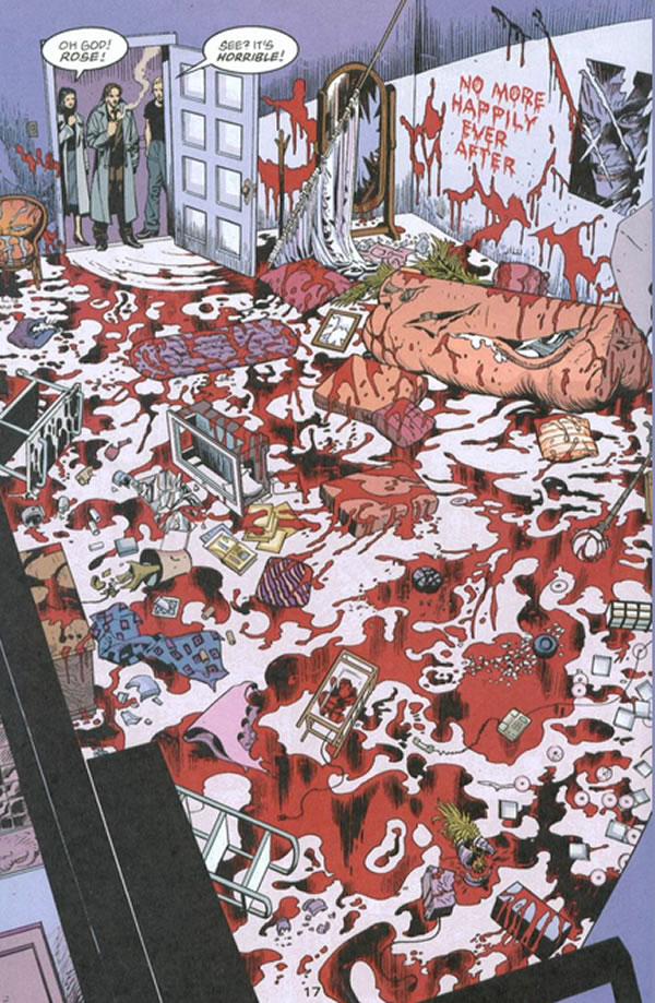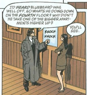 Remember all those clues in the panels from issue one? Well here's the explanation for each of them. ![]() ![]() The blood? It turns out the blood was collected over a period of time and kept fresh in the freezer. Rose Red and Jack were in cahoots all along. The whole thing was done to avoid marriage to Bluebeard, which was agreed to for a huge amount of money that Jack lost in a failed investment. In the end, Bluebeard is payed off by the money raised by the raffle, with the leftover going to the Prince. The point is, money solves it. Sometimes it seems it all boils down to money doesn't it? The first five issues of Fables are very good, but the issues going forward are even better. |