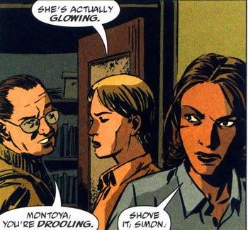Not enough? How about this comment from Simon to Montoya (who is gay). Page 13 panel 4.
