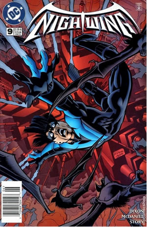 Scott McDaniel's art melds perfectly to Chuck Dixon's storyline here. McDaniel rightfully gives each scene an 'Alice in Wonderland' vibe. What impresses me most is how he balances the art so that it feels cartoony without tipping over to the issue being a cartoon. Features and gestures are exaggerated, the scenery is a bit warped, panels are slightly lopsided, small panels get pasted on to page-wide splash covers, all of these add to the effect of the scenes being inside Dick's fevered dream. As a bonus the the women are drawn so fetchingly. Check out Selina (Catwoman), Donna (Wonder Girl) and Poison Ivy.
