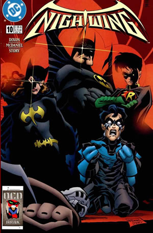 The stylized 'Nightwing' logo that appear on these issues of Nightwing have my vote for 'Best Nightwing Logo Ever'. Beautiful colors on the cover too and a balanced layout. Batgirl does not appear in this issue but I'm not complaining about her presence on the cover - it just adds to the 'Buy Me' effect. I had to do a double-take on the crying Nightwing though, he looks ten years old here. Still, this cover accomplishes its purpose: It makes me want to open the comic and read it.