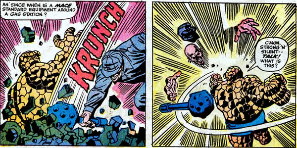 Oh yes, the magical harmonica remains too, and the fight is on for the next one to blow into the damn thing. Here's a very nice panel of the tussle between the well matched Thing and Executioner.