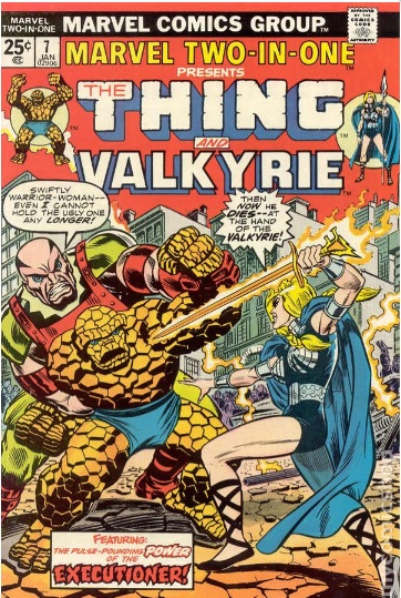 Doctor Strange and the Thing are still embroiled in this story. It's amusing to note, that last issue read like a Doctor Strange story while this one will read like a Defenders story. Not to leave out the Thing in his own comic, he is sent to a location by Doctor Strange (a founding member of the Defenders) where he can rendezvous with Valkyrie. On the way, Ben stops at a gasoline station where he encounters the Executioner.