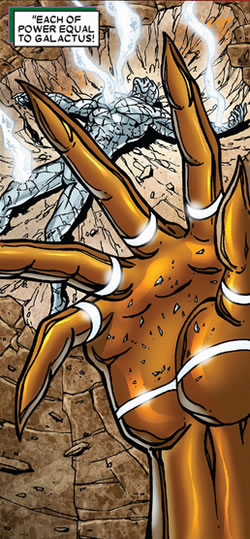 Un-effing-believable. What happened!? And yes, that second picture shows Galactus, Devourer of Worlds, laid low and bound. This is even worst than when he got thrown out by the Beyonder in Secret Wars. Okay. Blame Thanos. I should've known this guy would be major trouble. He created the technology keeping Galactus in thrall. It's actually quite interesting in a ruthless sort of way. Thanos has divined that Galactus is a huge processing plant that converts planetary matter and energy to Cosmic Energy. What that machine does is it continues to use Galactus to process the Power Cosmic but it feeds the power to specialized storage batteries for the subsequent consumption of Annihilus. Galactus is allowed a trickle of energy, enough to keep him alive as a part of this machine. It is both cruel and humiliating. Signature Thanos. We've taken a peep at the gods and we'll go back to them shortly. Right now let's go back to the demigods. Namely the Heralds of Galactus. Because a picture paints a thousand words: