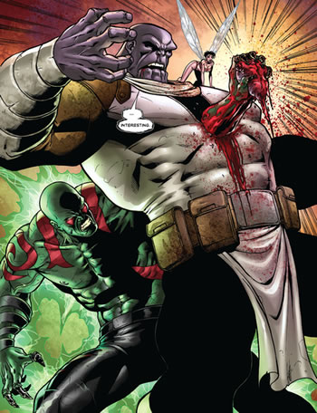 The Destroyer's victory could not have come at a worst time. Thanos was within moments of releasing Galactus. The Mad Titan tiring at last of serving Annihilus he was about to use his vast power as a trigger to set the Devourer free - but he died before that could happen. Nonplussed, Drax compels yet another source of vast power to free Galactus.