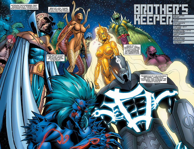 He's literally cracking. The question must now be asked: Who the F are Aegis and Tenebrous? These two literally came from nowhere and took out the G. Who are they? Once again, Marvel chooses to widen our vocabulary. Aegis and Tenebrous are referred to as proemial beings. That is, they were created at the very beginning of the Universe, together with many others, to maintain the cosmic balance. Here's the entire team at at the start of the universe.