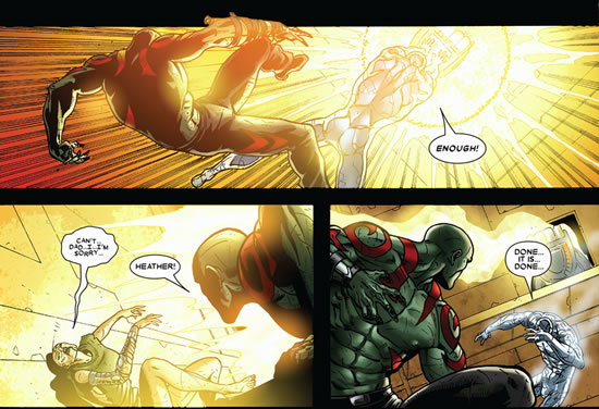 It turns out that these are old gods and they fought an equally ancient war with Galactus. A war that they lost, and, as a consequence, Galactus imprisoned them. Now, it seems, they have finally avenged themselves on their old foe. From this fall it is a short journey for Galactus to the "tender mercies" of Thanos' nefarious machine. And with the fall of Galactus night descends on the universe. The war is lost. Fortunately, somebody forgot to give Drax the memo. The need to destroy Thanos seems to be grafted into Drax's DNA. To be fair, Drax seems to have succeeded because Thanos does not defend himself (no surprise, why should a lover of Death be afraid to die?). In the end Drax finally achieves his prime imperative.