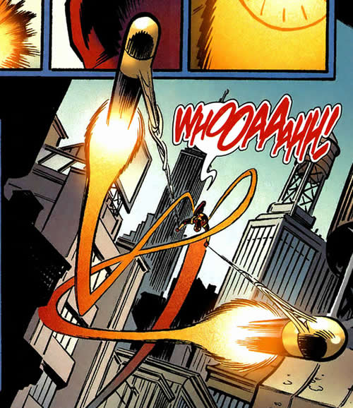 Because J. Michael Straczynski is the writer of both Civil War: Amazing Spider-Man and part-writer of Civil War: Fantastic Four, we get a nice treat : coverage of the same event in both books. I consider this a plus because the point of view is different and so is the artist. In the Fantastic Four book we looked at it from the vantage point of The Thing, here we take a look at it from Peter's viewpoint The event we are talking about is the convoy route of some Pro-Registration prisoners under escort from Iron Man's team and the subsequent ambush of the convoy by Captain America and company. During the course of the action, missiles are fired against the convoy by a gunship that is part of the Pro-Registration side. No explanation is given in Civil War : Amazing Spider-Man for this occurrence but in Civil War : Fantastic Four it is explained that this is due to the interference of the Puppetmaster. What is shown by both books is how Spider-Man catches two rogue missiles. Here's the panel from Civil War : Amazing Spider-Man.