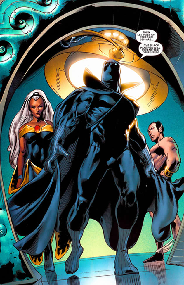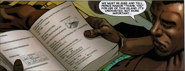 Posted - June 15, 2013 | Updated : August 11, 2015 Previous: Civil War Amazing Spider-Man Civil War : Black PantherI love that each collection under the Civil War banner adds something to the main storyline - making it richer and deeper. Civil War: Black Panther adds the international dimension. After all, the Black Panther, T'Challa, is Wakandan - in Civil War terms an outsider looking in. He's also a newly married man, to Ororo, Storm of the X-Men. Civil War: Black Panther allows us to go with T'Challa and Ororo as they tour "the major global centers of power". In the context of the Marvel Universe that would mean Latveria, Attilan, Atlantis and the United States. Let's go . . . First stop, Doctor Doom's Latveria. Ah wait, before that, let's look into the first couple of Wakanda sometime before their "tour". They are spending their honeymoon on an uncharted island the location of which was provided to them by Namor, the Submariner. Look at this panel showing what T'Challa is reading while he is on honeymoon.