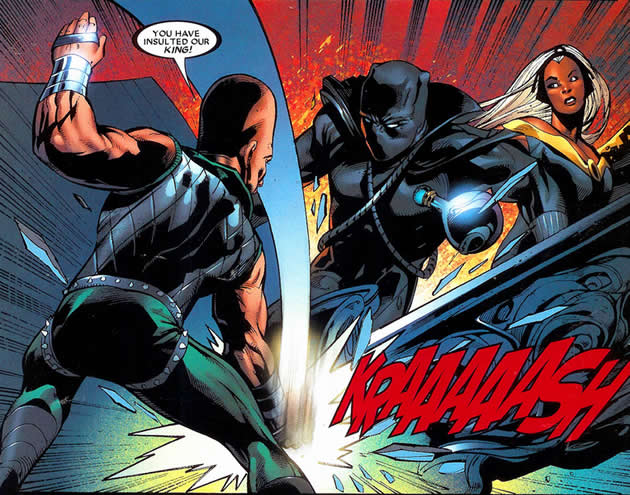 All hell breaks loose and a Sentinel (piloted by Jim Rhodes a.k.a. War Machine) goes after Ororo in front of her husband - the Black Panther.