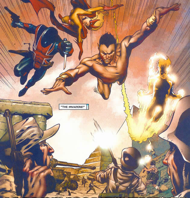 Great rendition, except for the Torch, who looks more like Nova (herald of Galactus), than the Human Torch. It's the coloring, the Torch should have a red hue rather than yellow as depicted here. The girl in red and yellow is Spitfire, a super-speedster.The one wearing the British Flag is Union Jack - his costume is still one of the best I've ever seen. Here is another great pinup of this Atlantean meeting from Manuel Garcia.