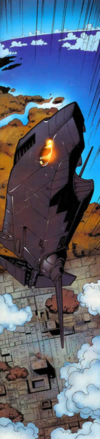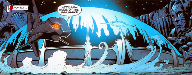 Storm, one of he most powerful X-Men, saves the day for T'Challa. Not your typical diplomatic tour is it? Next up: Attilan in the Dark Side of the Moon. The Inhumans make an offer of transportation to Ororo and T'Challa but they respectfully decline because Wakanda has its own space-capable ship. And what a ship - unlike conventional rockets, the Wakandan craft does not use liquid rocket fuel and internal combustion - 'primitive' technologies - that the Wakandans have eschewed in favor of harnessing Earth's magnetic field. Here is an excellent panel by Manuel Garcia showing the craft with Attilan in the background.