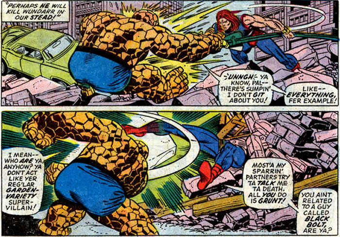 What better nanny for the super-strong Wundarr than the super-strong Thing? Poor Ben. Actually not quite. The Fantastic Four have a hierarchy. Whenever the Thing needs to pass the buck "Poor Ben" becomes "Poor Reed".