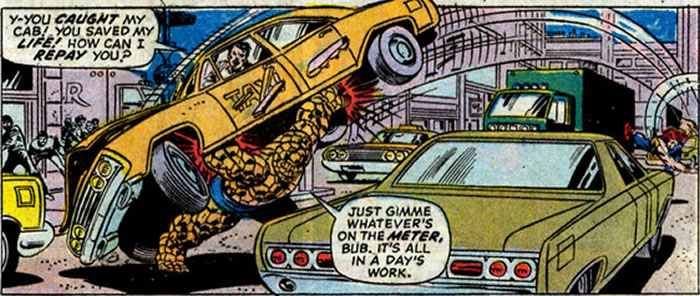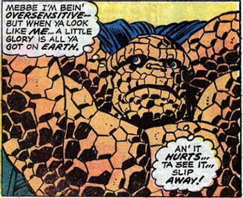 The Thing is mad that the Man-Thing, the Everglades monster, also has the word "Thing" in his name. Ben actually hops on a bus to go to Florida to have it out with the Man-Thing for this "infringement" on his monicker. Later on, we catch Ben thinking that, yes, he's behaving a bit irrationally.
