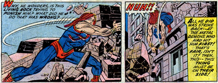 I mentioned the Molecule Man's significant weakness but now we are witness to his significant strength: The ability to affect living matter! Fortunately he is more sadist than killer. Instead of killing both the Thing and Man-Thing he toys with them, he reverts both to human form.
