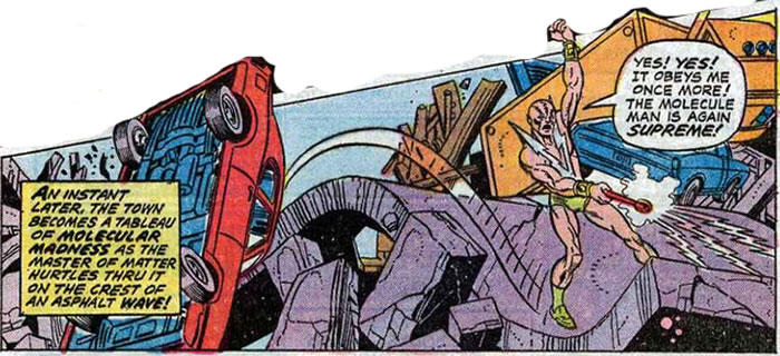 Speaking of the Thing, he makes it to Florida but his first encounter is not with the shambling Man-Thing but the new Molecule Man out for revenge. The following panels are telling of this encounter.