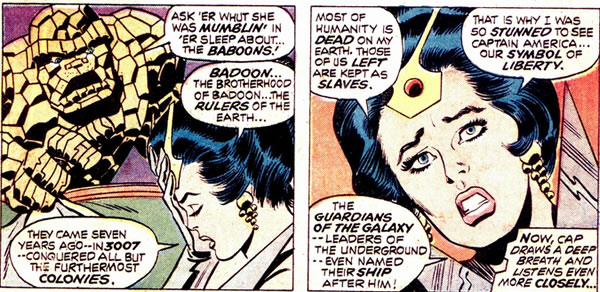 Ah, pieces of Marvel history. The Badoons (who Ben will repeatedly keep referring to as the 'Baboons') are an advanced yet savage space-faring race like the more familiar Kree, Skrull and Shi'ar. Unlike the other star-faring races, the Badoon occupy the Milky Way galaxy with us - so of all the space empires they are the nearest to Earth. Also mentioned are the Guardians of the Galaxy - more of these guys later, we'll actually meet them.