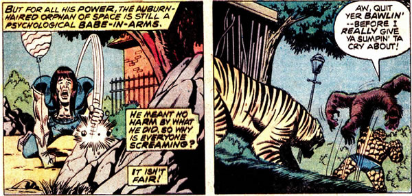 To the left, Wundarr is in full toddler mode. What makes him really dangerous is he's as strong as the Thing. In fact the innocent Wundarr has used his prodigious strength to set the zoo animals loose, which explains the panel to the right. The Thing doing zoo cleanup duties. It's wonderful to see that huge animals like lions and gorillas are no problem for the Thing.