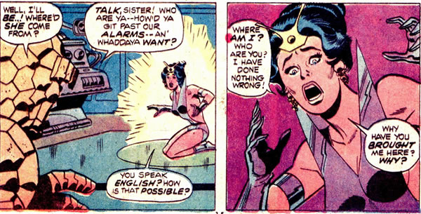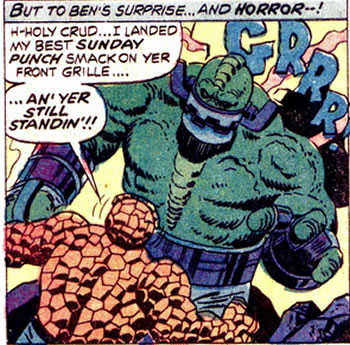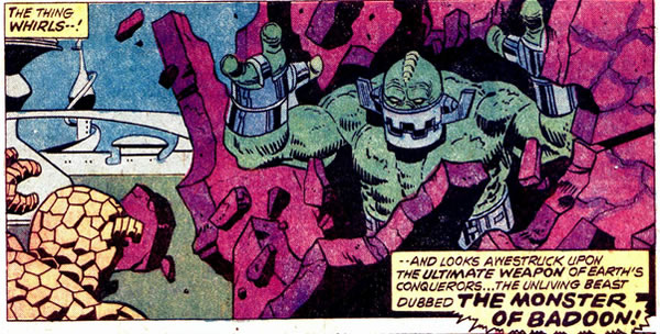 The truth is, it would not have been very effective against the Monster but fate loves the Thing, the monster falls on the interrogation machine and gets electrocuted. Not enough to stop it but the Hulk wannabe is out of the picture for now. Once again, the fight is on and once again the Thing shows us what it means to be the team strong man.