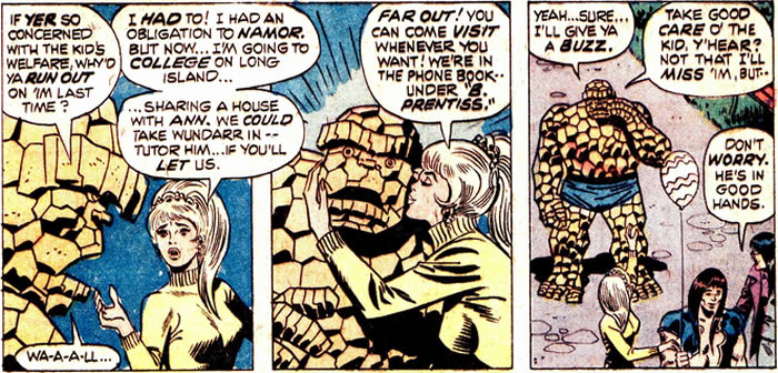 Who is Nita you ask? She's Namorita, Namor's cousin, and a future member of the New Warriors. Anyway, Nita was very taken with Wundarr the first time she met him from before and she has offered to take care of Wundarr since she has a place nearby.