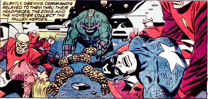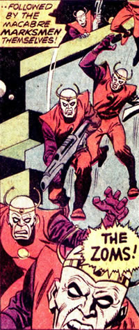 The Zoms are symbolic of just how cruel the Badoons are. These aliens have lobotomized humans to create mindless slaves. Lobotomized mind you, their brains are taken off. More than that, the Badoons have eradicated the Zom's ability to feel pain. Mindless warriors that can feel no pain. And entire armies of these Zoms are sent against our intrepid adventurers. Very early on, they realize that it's good to have the Thing.