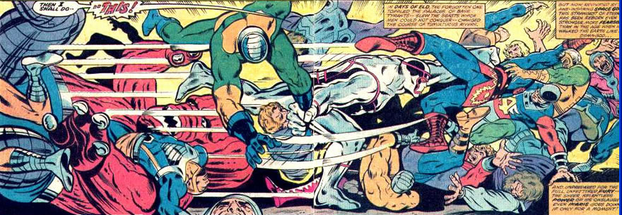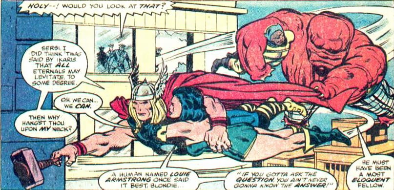 Not that John Buscema isn't an awesome penciller, he is, but I'm very happy to note the return of Keith Pollard. Pollard immediately lives up to expectations by presenting a great fight sequence as the Deviants ambush Thor and company on their way to the Deviant stronghold underneath New York. In the following panels, the Deviants bring out some heavy weaponry and we get to see the toughness of Karkas and the power of Mjolnir! ![]() Once again, Kro, ever the hostage-taker, threatens Thor with the life of Karkas and obtains the hammer and lifts it!? There is an enchantment attached to Mjolnir that says only the worthy can lift it. Is Kro somehow worthy? The hostage taker? ![]() With Thor and his allies captured, and the first wave of Eternals under Ikaris also captured, the Deviants have the upper hand. Ikaris, nonetheless, outlines his plan of an Alliance between the three Celestial-spawned races. This request is spurned by the Deviant leader Tode. Apparently, the Deviants haven't learned a lesson during their trouncing during the Second Host. According to Tode, their weaponry advancements will now allow them to control the Celestials. And now for the big reveal. Thor is really Sersi courtesy of Sersi's illusion-casting powers. ![]() And the reason Kro can lift the hammer is because it is nothing more than Donald Blake's walking stick. ![]() It's excruciating to watch Donald Blake come out from hiding and wrestle with Kro for the walking stick. Not only does Blake have merely human strength, he's also hampered by a leg disability. Thomas and Pollard shows that it's only by accident that the stick hits the floor and summons up the mighty Asgardian. Now we're back to fighting between the two groups. Thor's group has the advantage of being joined by Ikaris and his group. But the Deviants unleash Metabo, a four-armed super-Mutate. The fight is wonderful to behold and the ending perfect. Come and say it loud . . . "Thy malevolent masters have made thee strong indeed, Mutate . . ." ![]() "Still thou dost now face Thor, God of Thunder --" ![]() "-- Thor, Lord of the Living Lightning --" ![]() "-- Thor!" ![]() At this point, the Deviants have set there New York base to self destruct. The explosion causes a mini-earthquake in Manhattan but Thor and his allies survive to head off to Olympia -fabled seat of the Eternals. Thor first learned of the Fourth Host of the Celestials being on earth on the third year of their fifty-year judgment. Then he verified their location and the loyalty to them of the Eternal Ajak and his cohorts (Ajak had others with him not shown in the issue but shown in Eternals No. 1). In the same story, Thor also knows what answers he can get from Odin which is none at all, for some reason, the All-Father chooses to be mysterious about it. Back in New York, Thor has fallen in with the other Eternals who are trying to build an Eternal-Human-Deviant alliance to go up against the Celestials. During the course of these twin issues Thor and the Eternals find out that the Deviants will have nothing to do with an Alliance and plan to take on the Celestials on their own. We find the group approaching Olympia, capital city of the Eternals. By now, you'll know that I am quite fond of Karkas (maybe because he reminds me of the Thing, my all-time favorite superhero). While in the Eternals ship, Karkas breaks out in a belly laugh. Look how cute the big lump is. ![]() Quite suddenly, their ship gets damaged. ![]() Later on it's pointed out that the flying object that winged the ship, causing it to crash, was a discus. My first reaction was to think it ridiculous that sports equipment could destroy a ship. But then I realized that the ones throwing it are Eternals who are superhumanly strong. Also noteworthy is the city that is shown below the ship in the panel above. That's a Jack Kirby city. Here, Thor is introduced to Zuras, chief among the Eternals. Zuras mentions that Thor has been exiled from Asgard. Change of scene. Back in Asgard, Odin sends out Sif and The Warriors Three on mysterious missions. Sif finds herself fighting against a Storm Giant. Look at the size disparity. ![]() The Warriors Three encounter Fafnir, a Storm Giant turned into a dragon by Odin, unlike Sif, they're not doing very well. There is a curious panel that could be an example of a situation were the artist simply ran out of time to finish the work. The art is rough, not characteristic of Giffen at all. Look at the backgrounds in this panel, in particular. ![]() That's actually better than the "stick man" background in the panel below. ![]() This white and magenta powerhouse is the Eternal known as the Forgotten Hero. First Karkas, now him. One of the reasons I'm featuring The Eternals Saga is because this Bronze era epic keeps throwing out such amazing characters. In the Marvel Universe the Forgotten Hero did all those deeds from ancient times that we attribute to such beings as Samson and Hercules. So he's very powerful as can be seen on this panel.