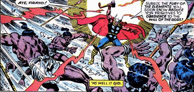 Posted - January 1, 2011 | Updated April 18, 2012 | August 13, 2015 Thor : The Eternals Saga Part 1 of 3This story combines two great creations within the Marvel Universe: Stan Lee and Jack Kirby's Norse-mythology inspired world of Asgard and Jack Kirby's Eternals/Celestials mythos. We begin with a backgrounder to the Eternals Saga, it shows related events a thousand years in the past; before Thor ever became Donald Blake and the Eternal Ikaris was but a youth. The backgrounder story has art by Walt Simonson. Five years later he would come back as both writer and artist of The Mighty Thor for a run so good people would refer to Simonson's Thor issues as some of the best ever. Doing a quick scan of the art, I note that this is not the Simonson I know from later years. There are hints here and there of his emergent unique style but his approach here cleaves to the Marvel house style - a form of drawing which I most associate with John Buscema. This story begins in Asgard at the present time. There is a prophecy among the Asgardians that is taken as truth : That the death of the god Balder will mean the death of all the gods. The event that they call Ragnarok. We are shown that Balder has already been struck down, but he is not dead. Odin, father of the Norse gods, keeps Balder in a state between life and death in an attempt to foil the prophecy and halt Ragnarok. The next clear task for the gods of Asgard is to bring Balder back amongst the living, but at this point they don't know exactly how to go about that, everybody is anxious and fretful. In the middle of all this uncertainty, Thor throws a tantrum by smashing a chair to bits. Here's the panel immediately following that childish display. ![]() Note the faces of the other Asgardian gods in the foreground, as rendered by Simonson; particularly the god in blue armor? That is a look of disappointment; exactly how I felt seeing the immortal Thor behaving like a four year old. But is it according to character? Yes it is. Thor is immensely powerful, he is used to getting his way. When that doesn't happen, he gets physical. This attitude was supposed to be addressed by Thor's time as Donald Blake. Next, Thor wanders off to the chamber of Mimir - the talking fire creature that Odin consults with, and to whom Odin gave an eye in exchange for knowledge. Here we are enlightened as to the origin of Mimir - a short, yet fascinating tale that points to Mimir as being an Asgardian god himself before his fiery transformation - his enmity against Odin and the other Asgardians is also explained. Though Thor's alter-ego of Donald Blake has been described as 'a shell' created by Odin for his own purposes, the story at this point pays attention to a curious quality of Marvel's Thor : His inordinate fondness for Midgard. This is a good point. Thor was a straight-on superhero for a long time. He might be the strongest Asgardian save Odin but any of the Asgardians could have come down to Earth as a self-styled hero - the typical Asgardian can survive small arms fire and can lift 20 tons. But the other Asgardians are indifferent towards Midgard. Thor rightly wonders why he is not. In his roundabout way, Thor voices two questions to Mimir: 'Is the Earth in danger?' and 'Who created man?' Mimir answers by telling a tale that happened a thousand years ago. Thor has forgotten this event (for reasons that will be revealed later). A thousand years ago, Thor journeyed to Earth and encountered the Eternals for the first time. The Eternals are engaged in a disinformation campaign, setting themselves up as gods to the humans inhabiting South America (the ancestors of the Incas, Aztecs and Mayans). Just like all colonialists, they delude themselves into thinking that they are somehow helping these humans. When a tribe throws arrows and spears at you within the boundaries of their land, they don't want your help, they are looking at you as an invader and they want you out. Here's an amazingly callous act from Thor and the Eternals: Thor and the Eternals land in the future Mexico and the people attack them. Let's look at this lone panel in detail shall we? A bunch of half-naked humans are attacking Thor and the Eternals - Valkin and Virako - with spears. Spears. Is the Asgardian and the Eternals in any danger? Absolutely not. They could have tried to talk and explain their intent even while the spears were bouncing off their invincible skins. But no, they decide to be needlessly heavy-handed, or, as Virako put's it: 'You know what to do, Thor.'. And Thor, big bully that he is, decides to whip the humans into line by calling up up a storm. At this point, the story doesn't need any villains, Thor is playing the part perfectly.