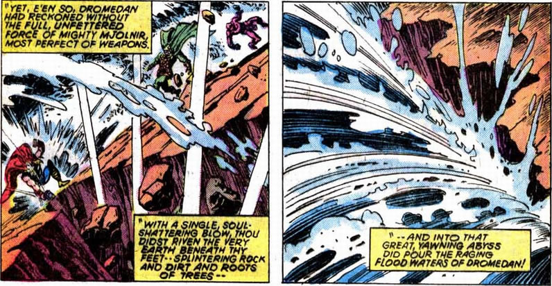 The next panel saves Thor from being an out and out antagonist as it conveys what's going on inside him. ![]() Thor is starting to realize that there are better options than the one he has taken. Next, Thor and the Eternals are assailed by three enemies including two Mutates - creations of the Deviants. The Mutate Dromedan is so powerful that his Deviant creators imprisoned him. The other Mutate is the giant Tutinax, known as the Mountain Mover. The third foe is Thunder, a being created by Dromedan from the imagination of the humans in the locality. There is a bit of creativity in the multi page fight scene as the Mutates and Thunder use different elements such as fire and water, and atmospheric effects such as darkness against their foes. The panel showing the water attack is quite impressive. ![]() Equally noteworthy is just how powerful a weapon Mjolnir is in the hands of Thor. What is shown below is Thor striking a blow with his hammer that is so powerful it creates a ravine large enough to contain a tidal wave.