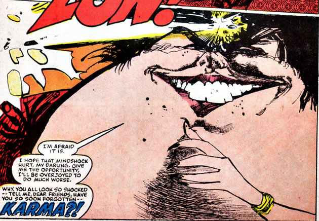 The even bigger shocker is that she's morbidly obese. What happened to Karma?! At this point we have to say goodbye to Bill Sienkiewicz together with a big thank you for the incredible art. Xi'an escapes and the Mutants track her down to Madripoor. Madripoor is an Asian island created by Marvel and designed to be a modern day equivalent of a lawless pirate's haunt; a great setting for all sorts of adventures - occasionally by heroes not named Wolverine. What follows is an assault on a guarded fort. I never knew how troublesome Karma's possession power could be; she's pretty adept, able to take over multiple hosts. Did I say troublesome? I meant unbeatable. Big Karma wins and enslaves her former teammates.